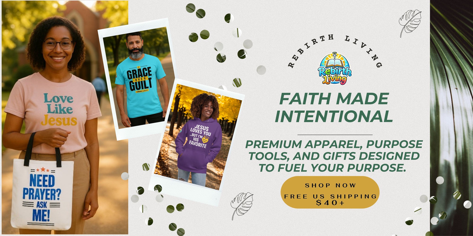 ReBirth Living selections are curated to support your faith journey. Every piece—from apparel that wears your conviction to Purpose Tools that anchor your study—is designed for daily renewal and living your purpose with courage and grace.